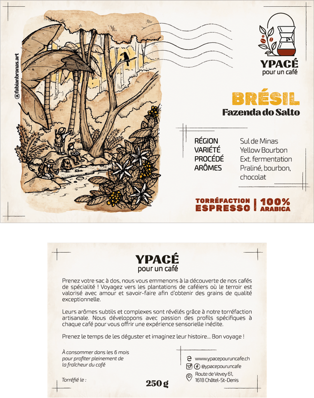 Située à Carmo da Cachoeira (Sul de Minas / 1'150m), la Fazenda do Salto est actuellement gérée par Otàvio Reis (5e génération) où différentes variétés sont cultivées (Yellow Catuai, Bourbon, Arara, Icatu, etc.) afin de produire des cafés "naturals" et "pulped naturals [honey]".