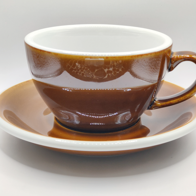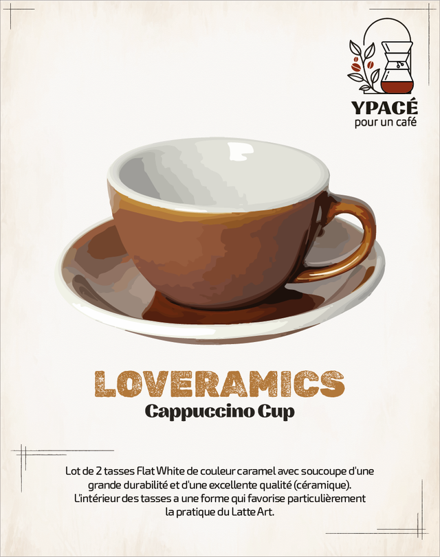 Lot de 2 tasses Flat White de couleur caramel avec soucoupe d'une grande durabilité et d'une excellente qualité (céramique). L'intérieur des tasses a une forme qui favorise particulièrement la pratique du Latte Art.