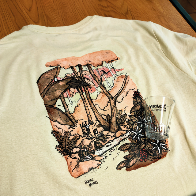 Alors devenez membre de notre team en acquérant votre T-shirt "YPACÉ pour un CAFÉ - À la découverte du café de spécialité" ! Composé de notre logo sur l'avant et d'une magnifique illustration réalisée par Fabian Branas à l'arrière, il est disponible en version "homme" ou "femme" avec des tailles différentes. Que du bonheur, des good vibes et de l'excellent café !